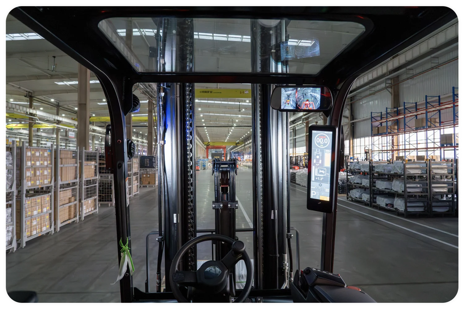 - De doorkijk-mast en het slimme ontwerp van het dak zorgen ervoor dat de chauffeur altijd perfect zicht heeft op de vorken en de omgeving.