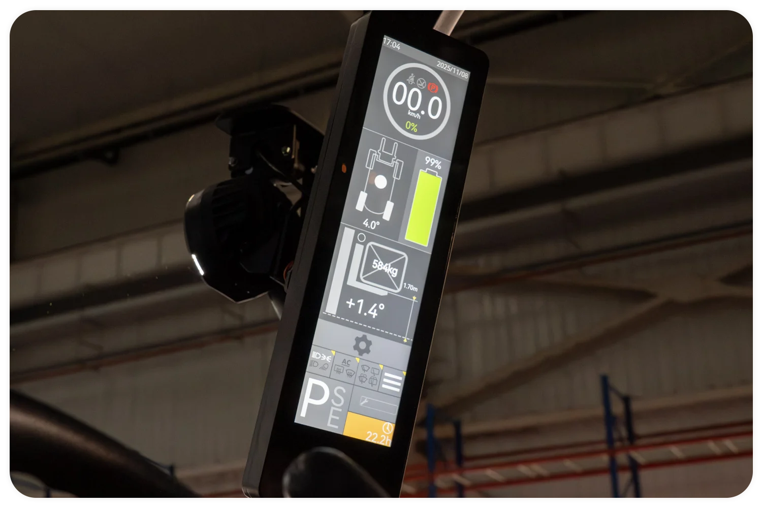 De heftrucks zijn standaard uitgerust met slimme technologie voor vlootbeheer en diagnose op afstand. Een handige extra is de automatische kantelknop, waarmee de mast met één druk op de knop precies horizontaal komt te staan.